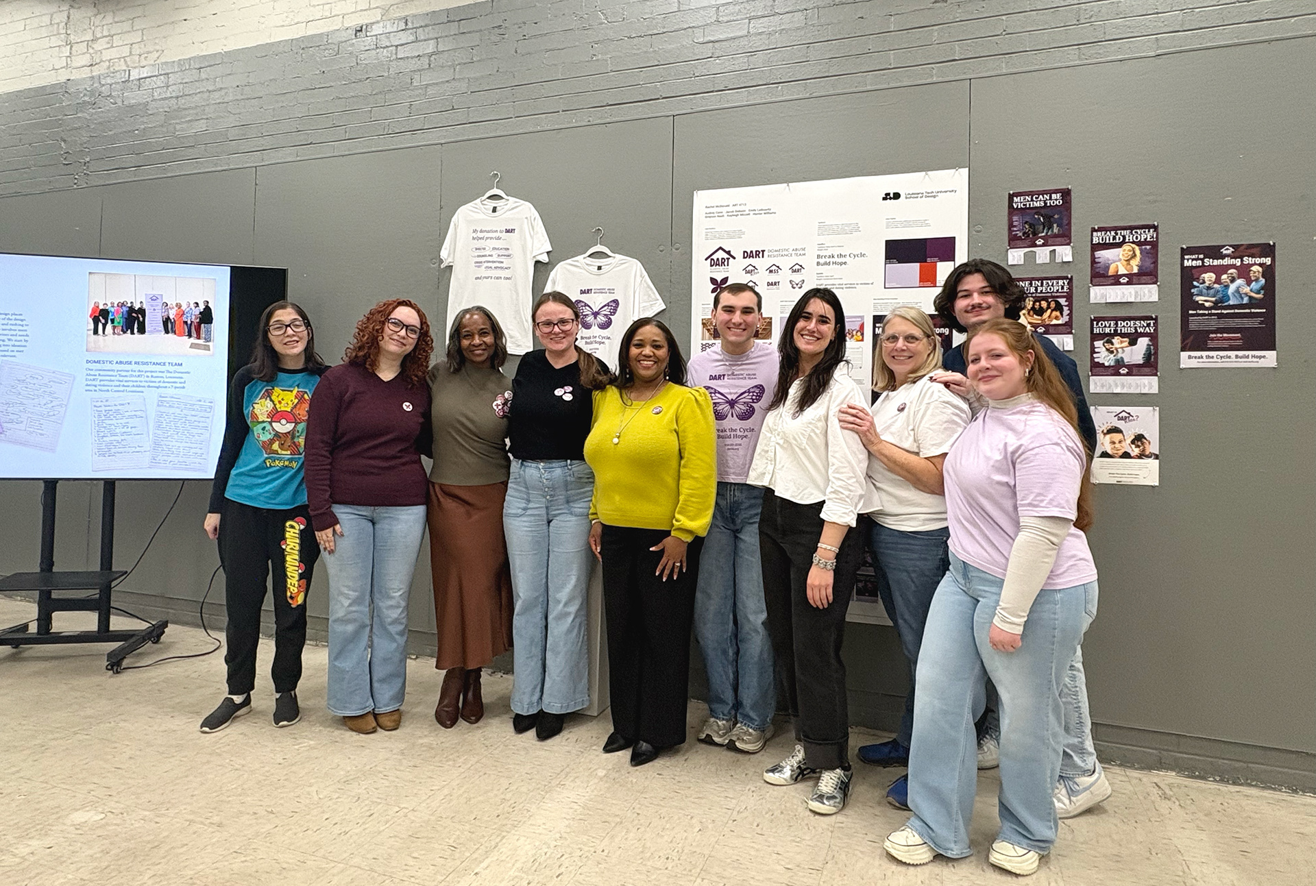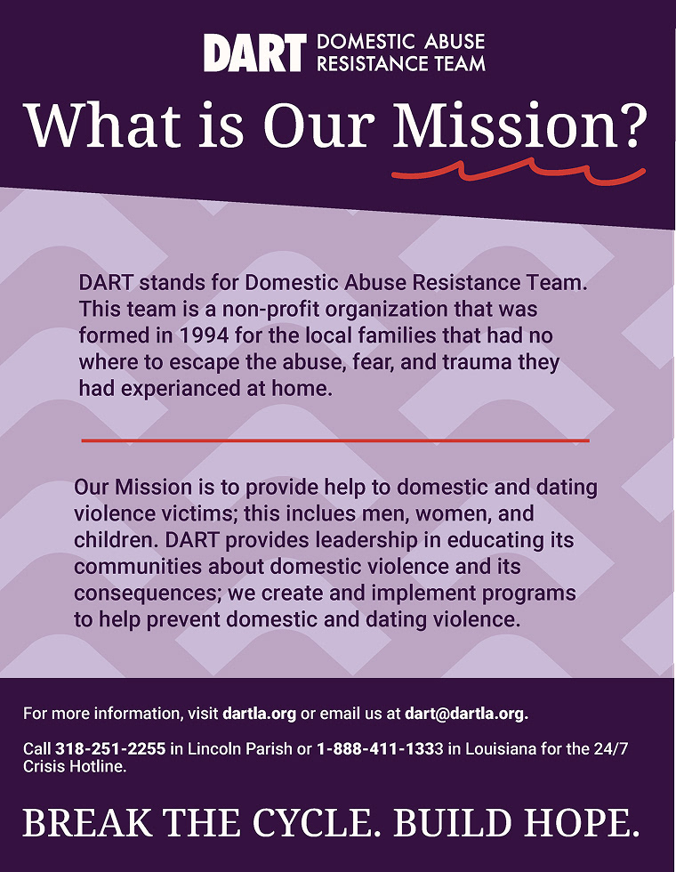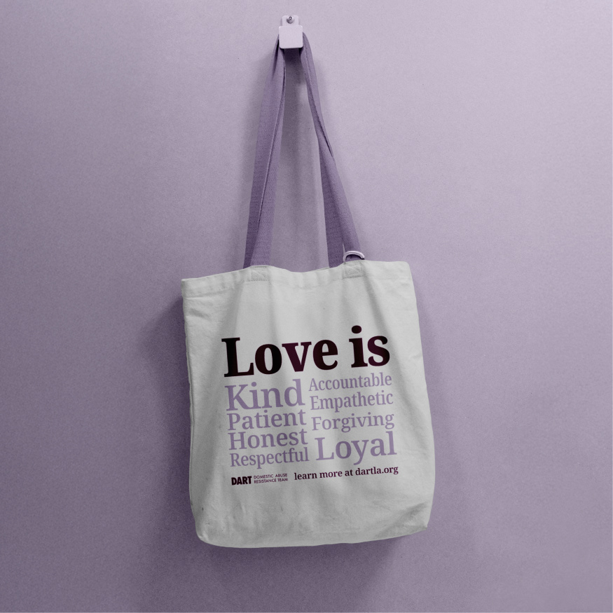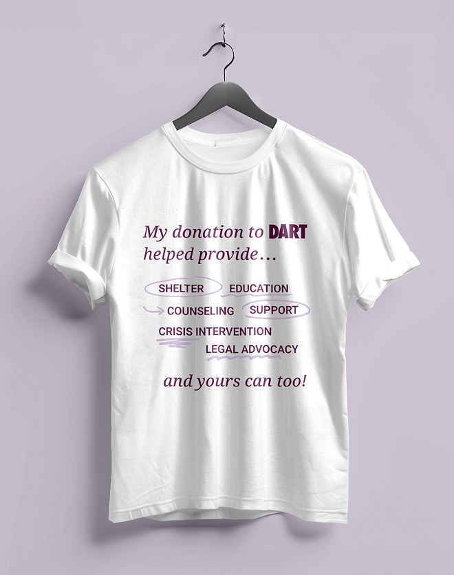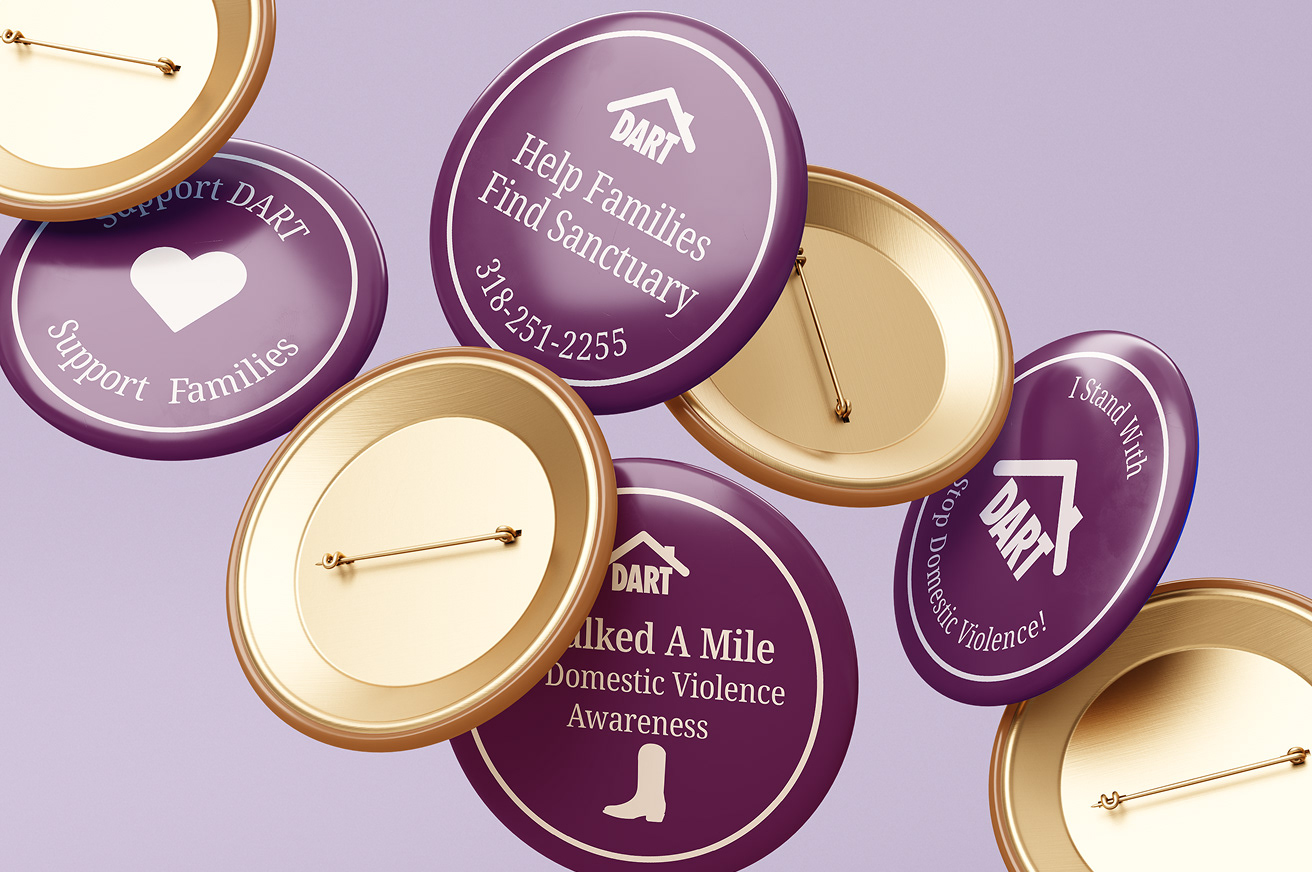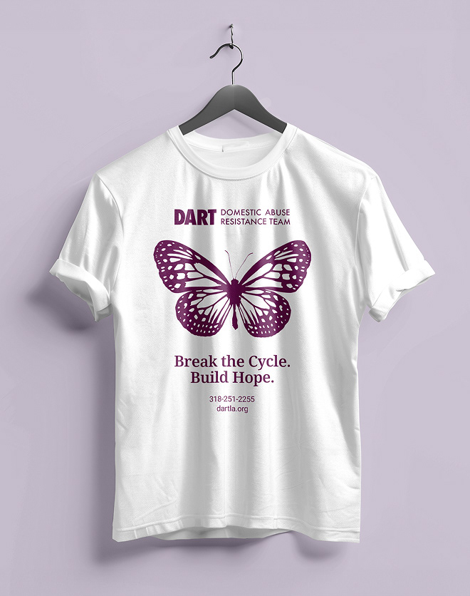 What is DART? DART stands for Domestic Abuse Resistance Team, a nonprofit organization with multiple locations, including a newly opened office in Ruston, Louisiana. The goal of working with this organization was to identify key challenges and develop communication solutions that address their need for broader awareness and stronger community outreach. As a six person design team, we created an improved brand identity, social media content, and posters, along with physical deliverables such as shirts, tote bags, and pins.