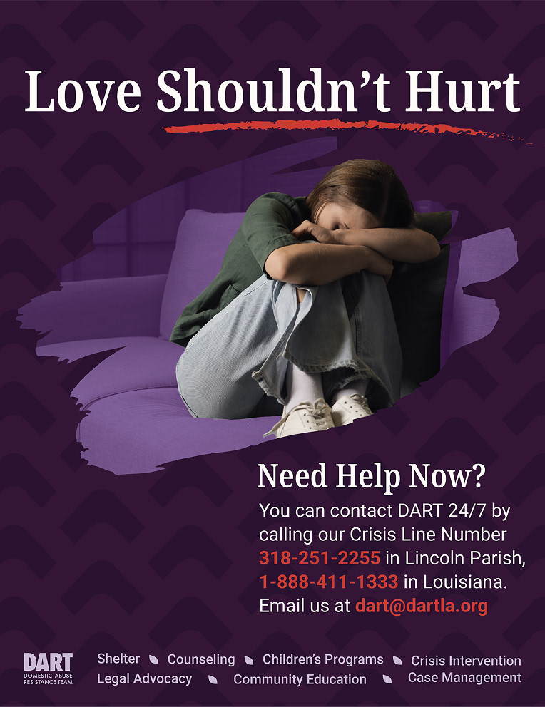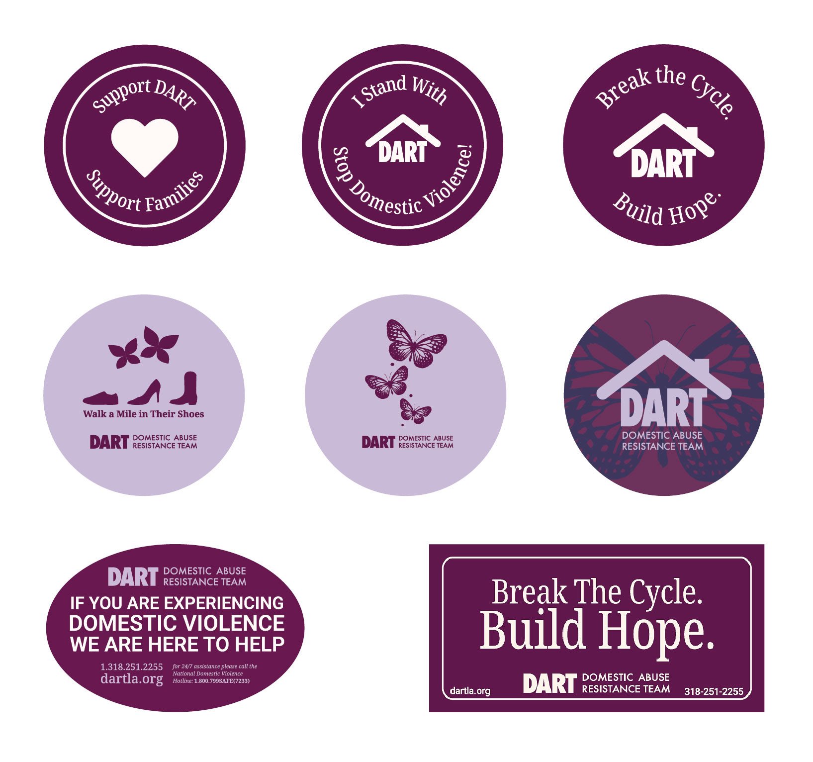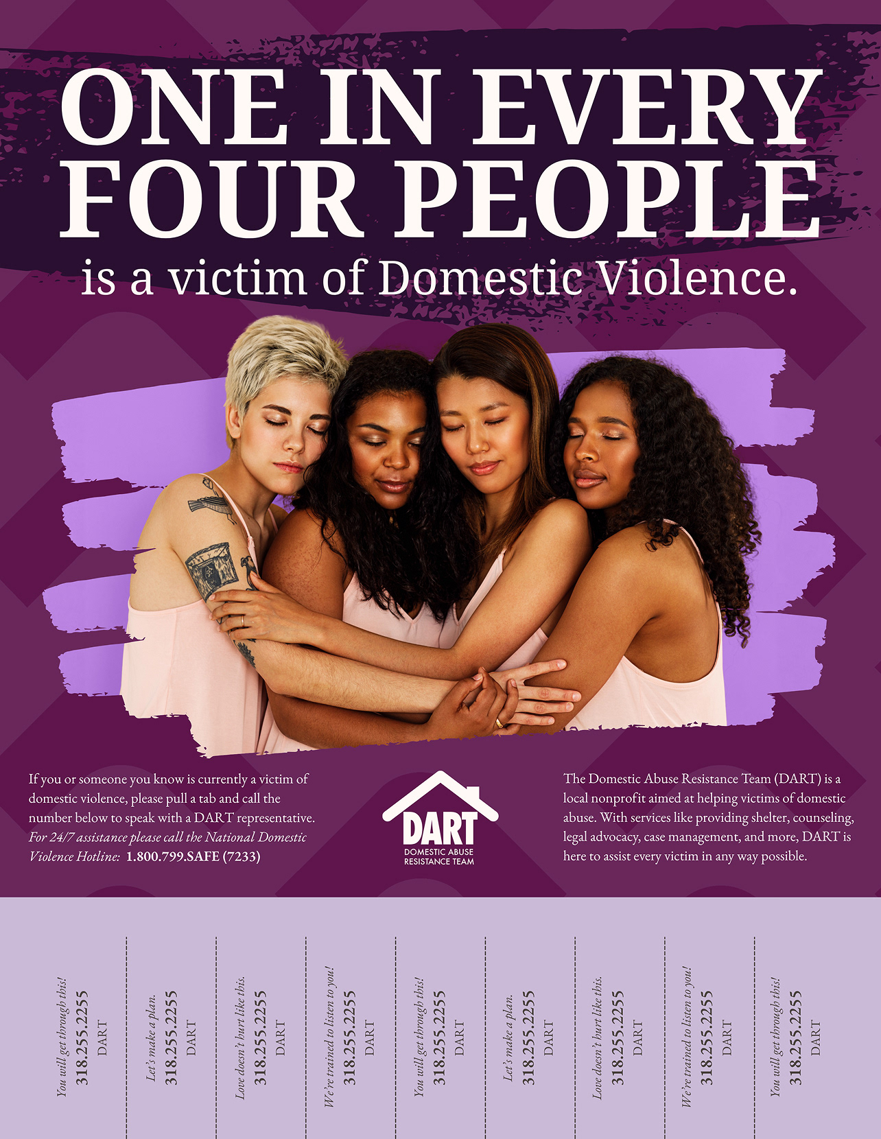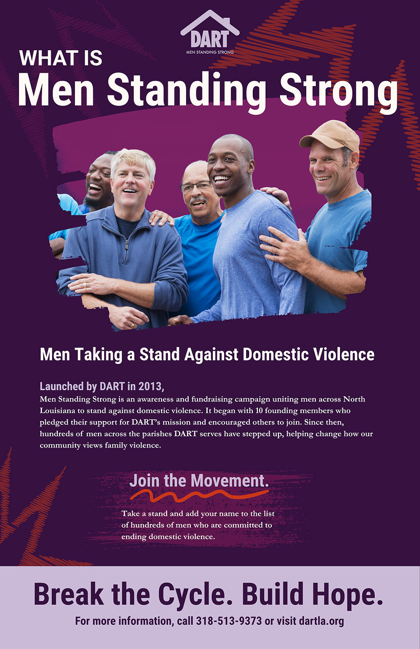What is DART? DART stands for Domestic Abuse Resistance Team, a nonprofit organization with multiple locations, including a newly opened office in Ruston, Louisiana. The goal of working with this organization was to identify key challenges and develop communication solutions that address their need for broader awareness and stronger community outreach. As a six person design team, we created an improved brand identity, social media content, and posters, along with physical deliverables such as shirts, tote bags, and pins.
