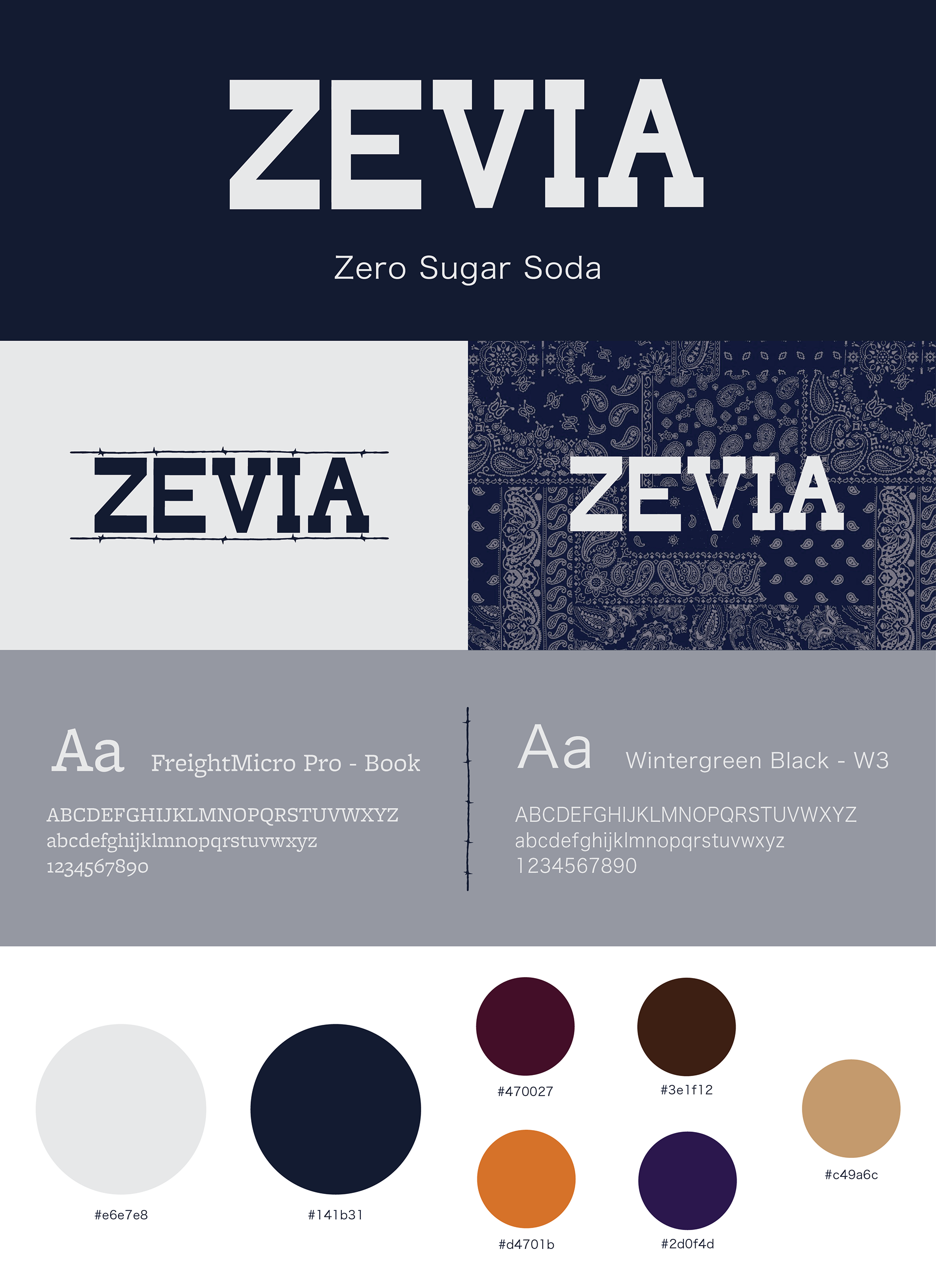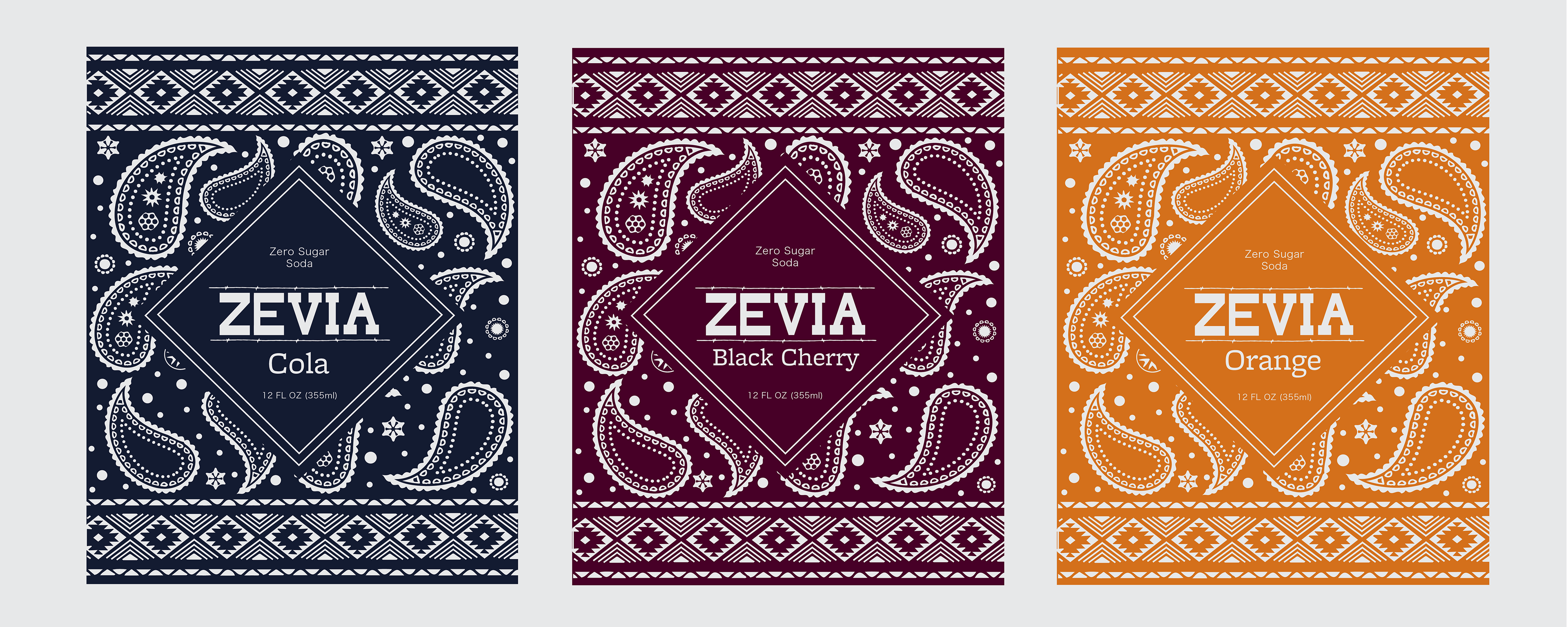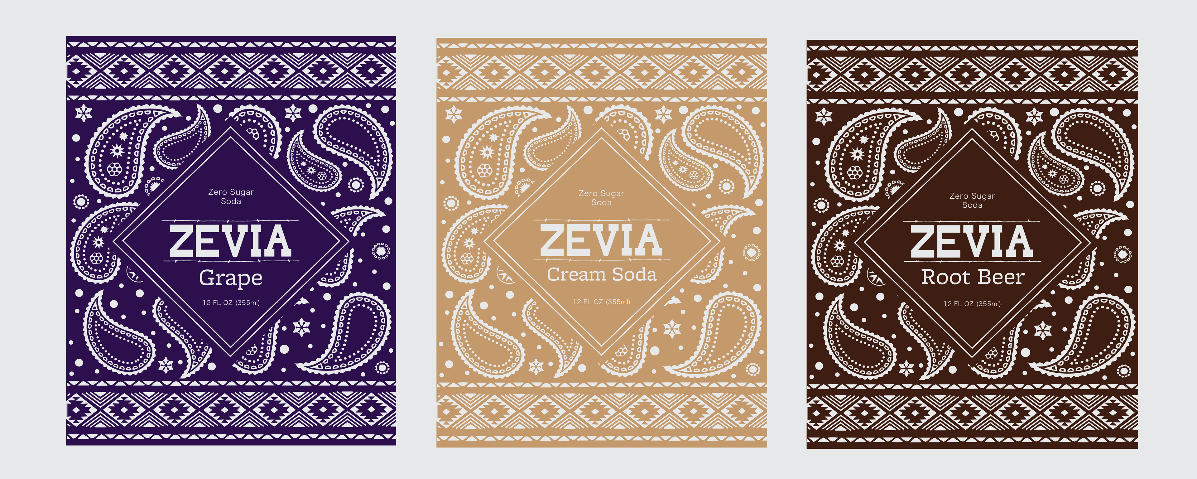 The goal of the Zevia rebrand was to reinterpret the existing soda brand for a new target audience of my choosing. This new visual identity is designed to resonate with individuals working in agricultural and rural fields, drawing inspiration from the familiar form of a bandana. Paisley motifs are woven throughout every element of the design, creating a cohesive system that transforms each can, box, and poster into said bandana.
