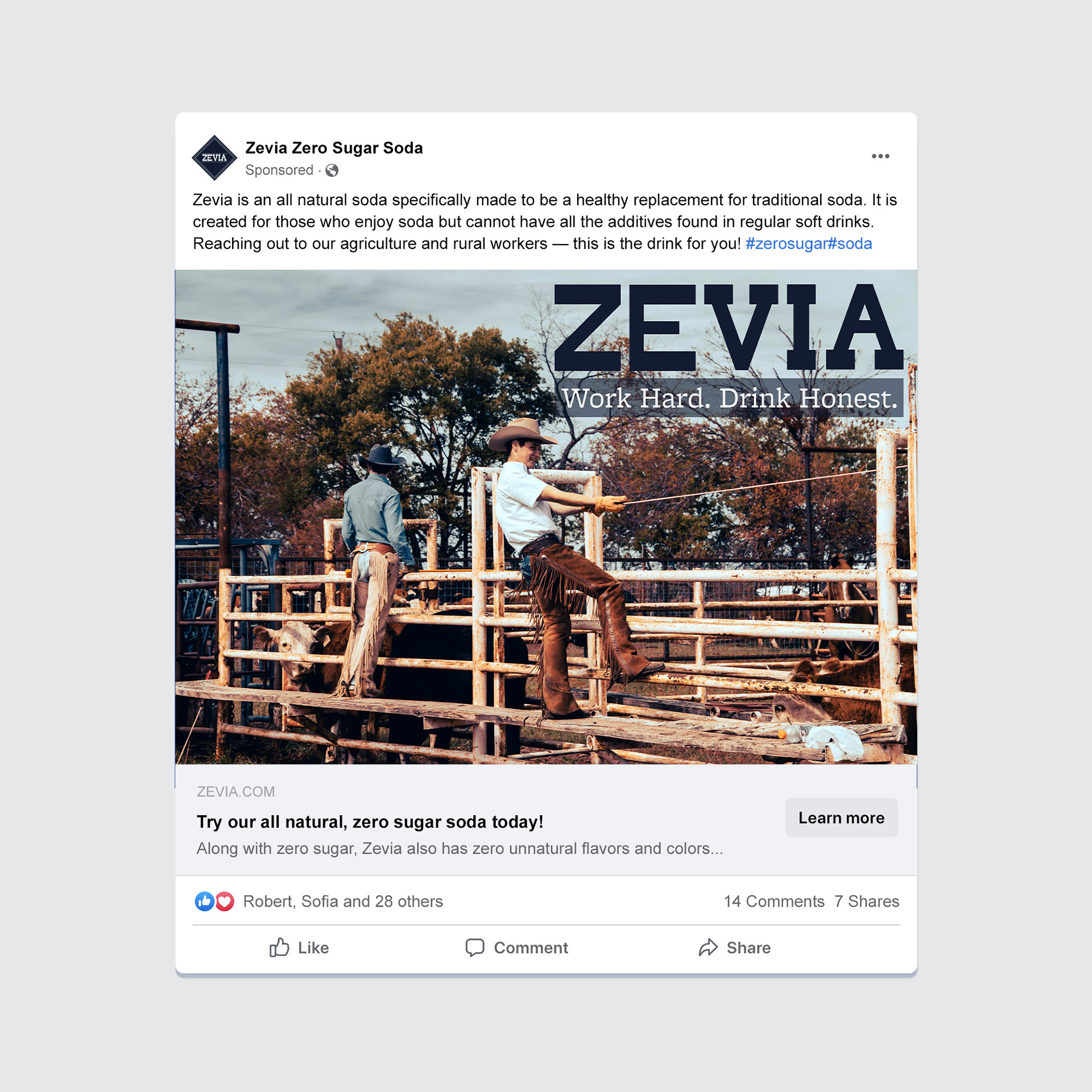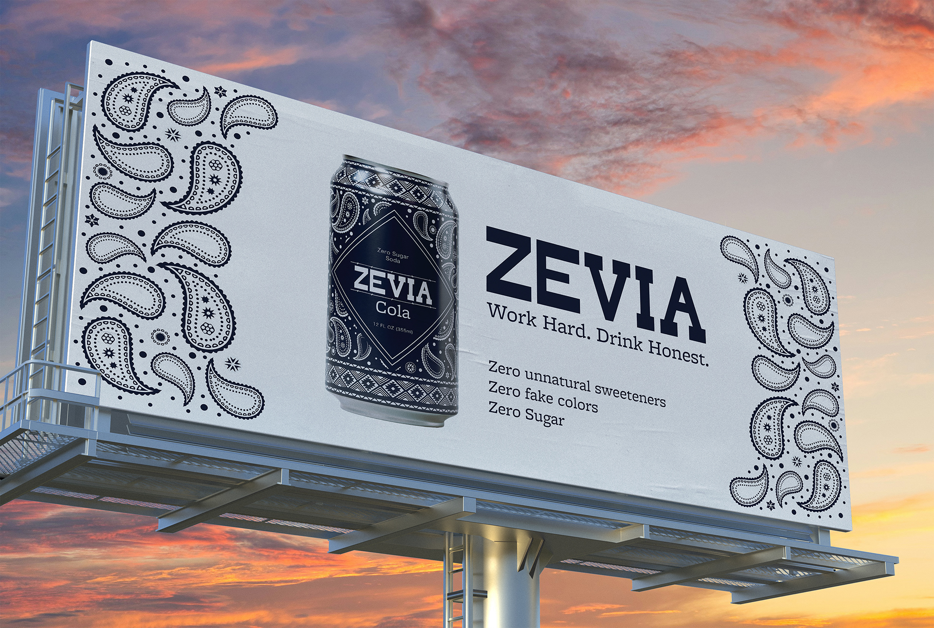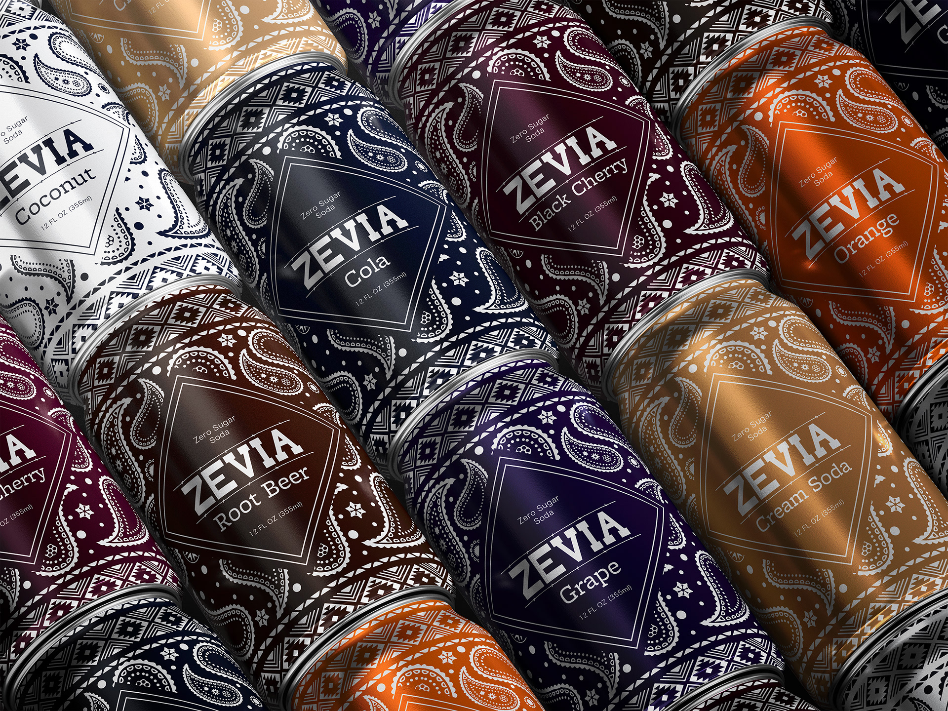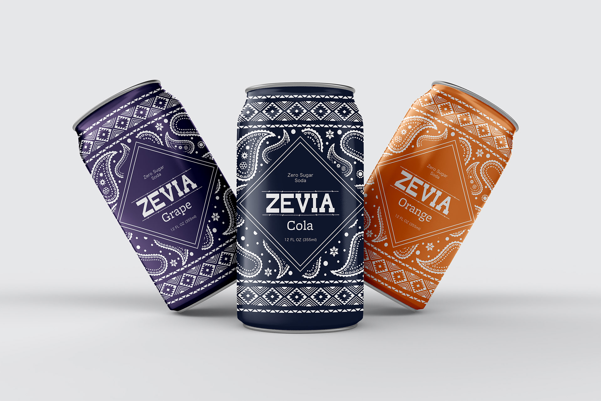 The goal of the Zevia rebrand was to reinterpret the existing soda brand for a new target audience of my choosing. This new visual identity is designed to resonate with individuals working in agricultural and rural fields, drawing inspiration from the familiar form of a bandana. Paisley motifs are woven throughout every element of the design, creating a cohesive system that transforms each can, box, and poster into said bandana.